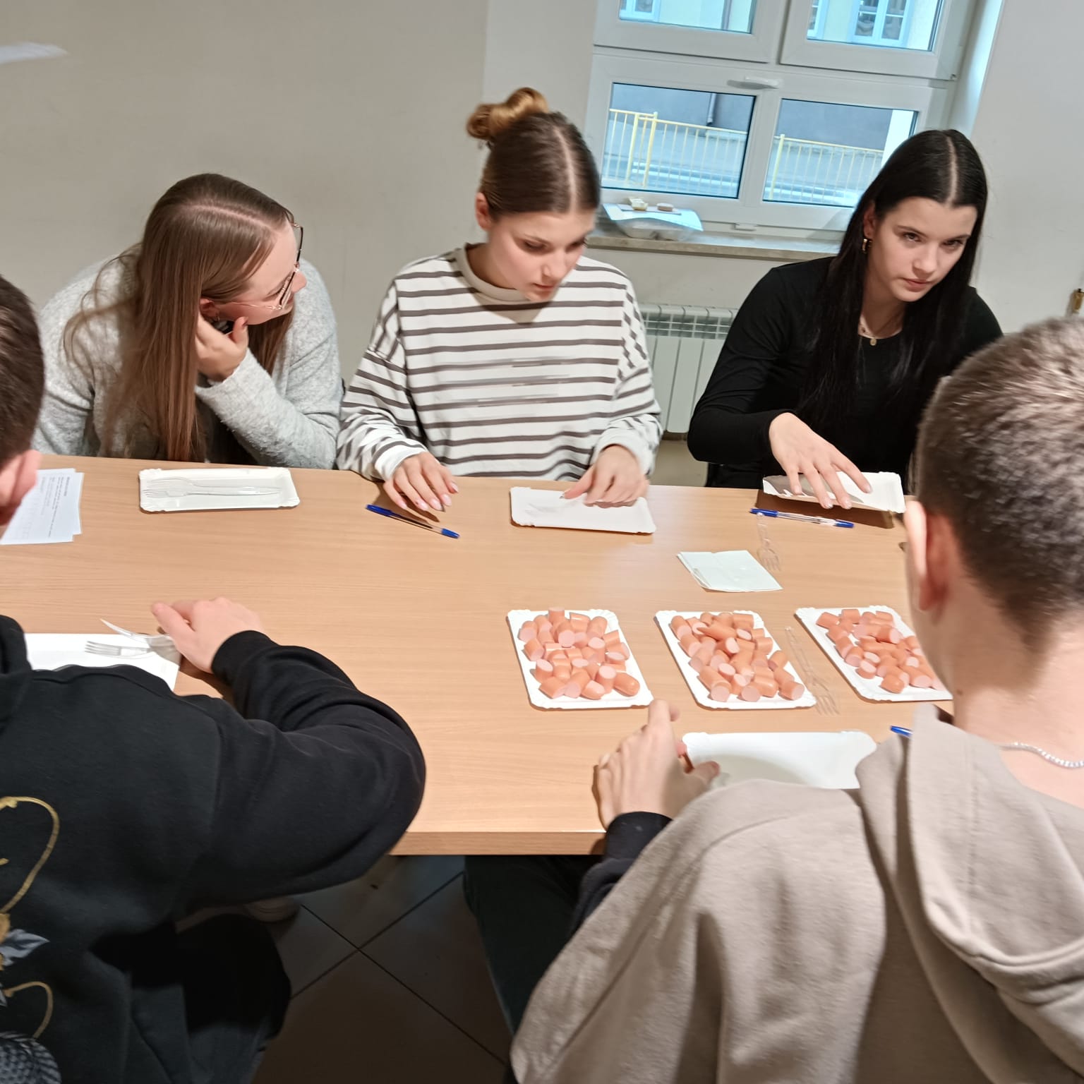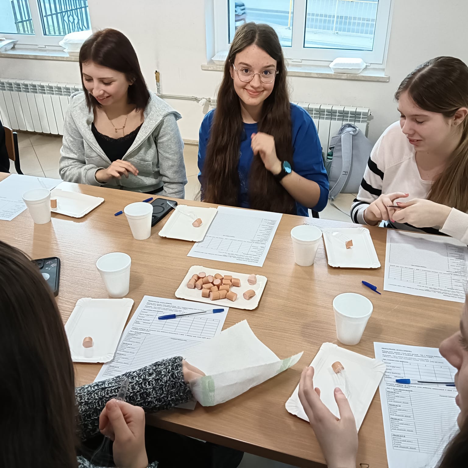 W trakcie zajęć przeprowadzono ocenę opisową produktów żywnościowych, w tym trzech rodzajów parówek.