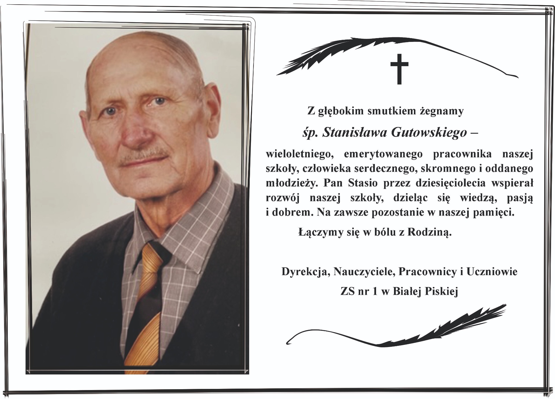 Z głębokim smutkiem przyjęliśmy wiadomość o śmierci 10.12.2025 r. p. Stanisława Gutowskiego wieloletniego emerytowanego pracownika naszej szkoły.